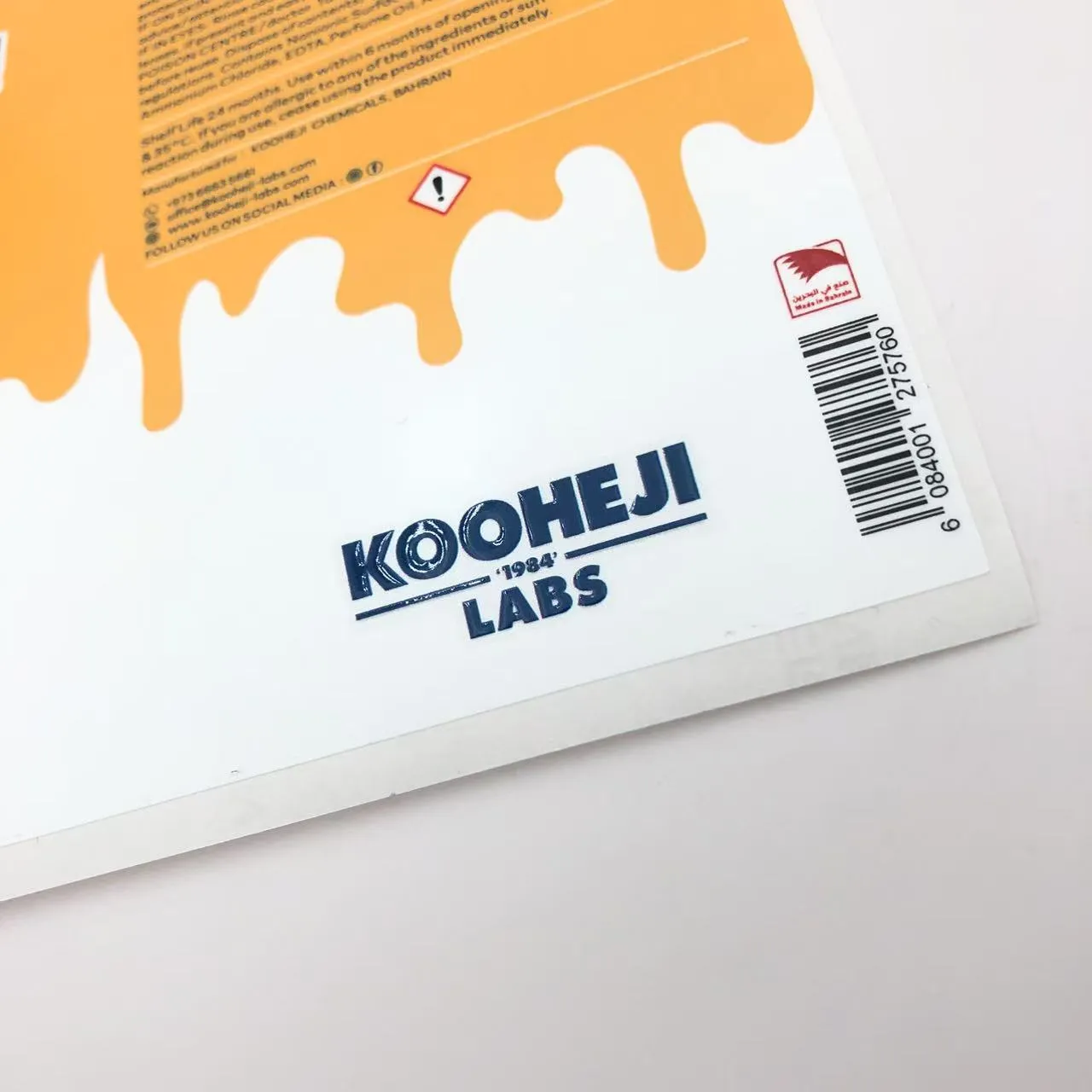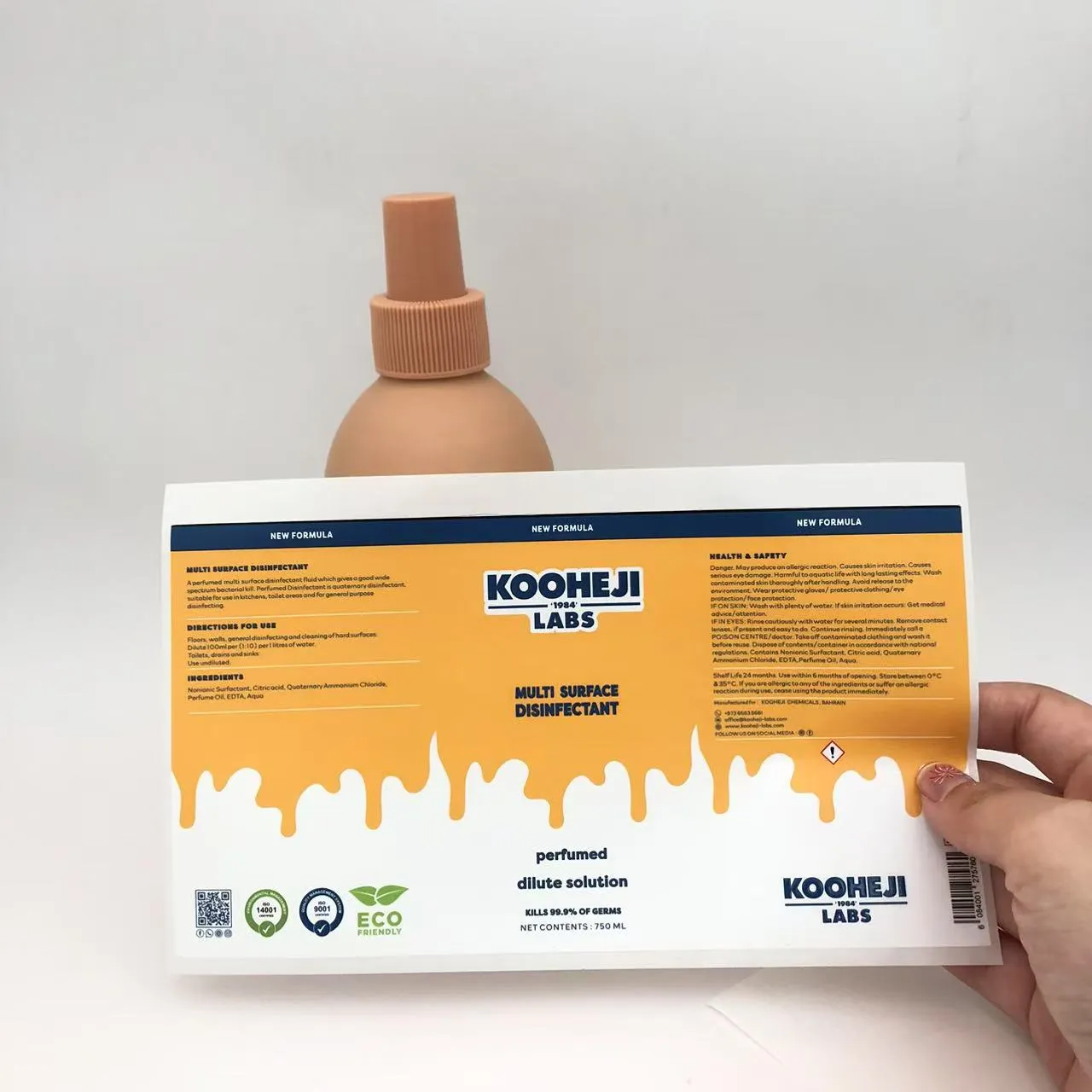 जोजो प्याककीटाणुनाशक बोतल प्याकेजिङ लेबलहरू अल्कोहल-प्रतिरोधी, स्क्र्याच-प्रूफ, वाटरप्रूफ र उच्च-आसंजनको साथ कठोर प्रयोग वातावरणको लागि अनुकूल छन्। यसले विभिन्न स्प्रे बोतल सतहहरूमा पूर्ण रूपमा फिट हुन्छ। थ्रीडी इम्बोस्ड र टेक्सचर्ड इफेक्ट र ग्लोसी फिनिशले तपाईंको ब्रान्डको भिन्नता र उत्पादनको ग्रेडलाई प्रभावकारी रूपमा बढाउन सक्छ।