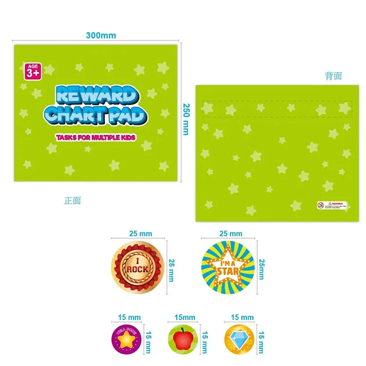 चुम्बकीय इनाम चार्ट प्याडहरूमा, त्यहाँ उपलब्ध स्टिकरहरूको दुई आकारहरू छन्। साना स्टिकरहरू स्टार्ट, ताराहरू, हिराका एप्पलहरू दिइन्छ, जसले बच्चाहरूलाई उनीहरूको दैनिक कार्यहरू समाप्त गर्दछ।