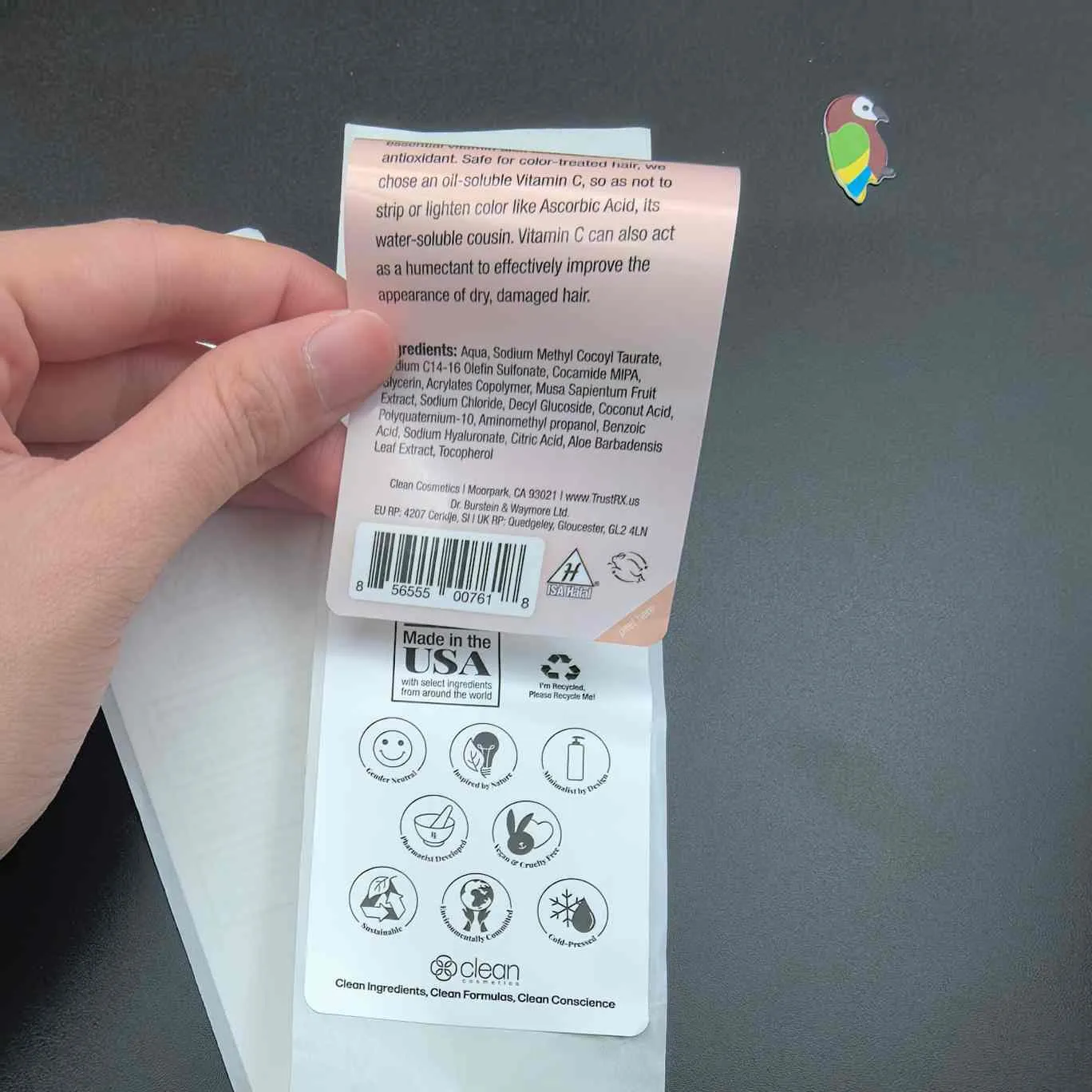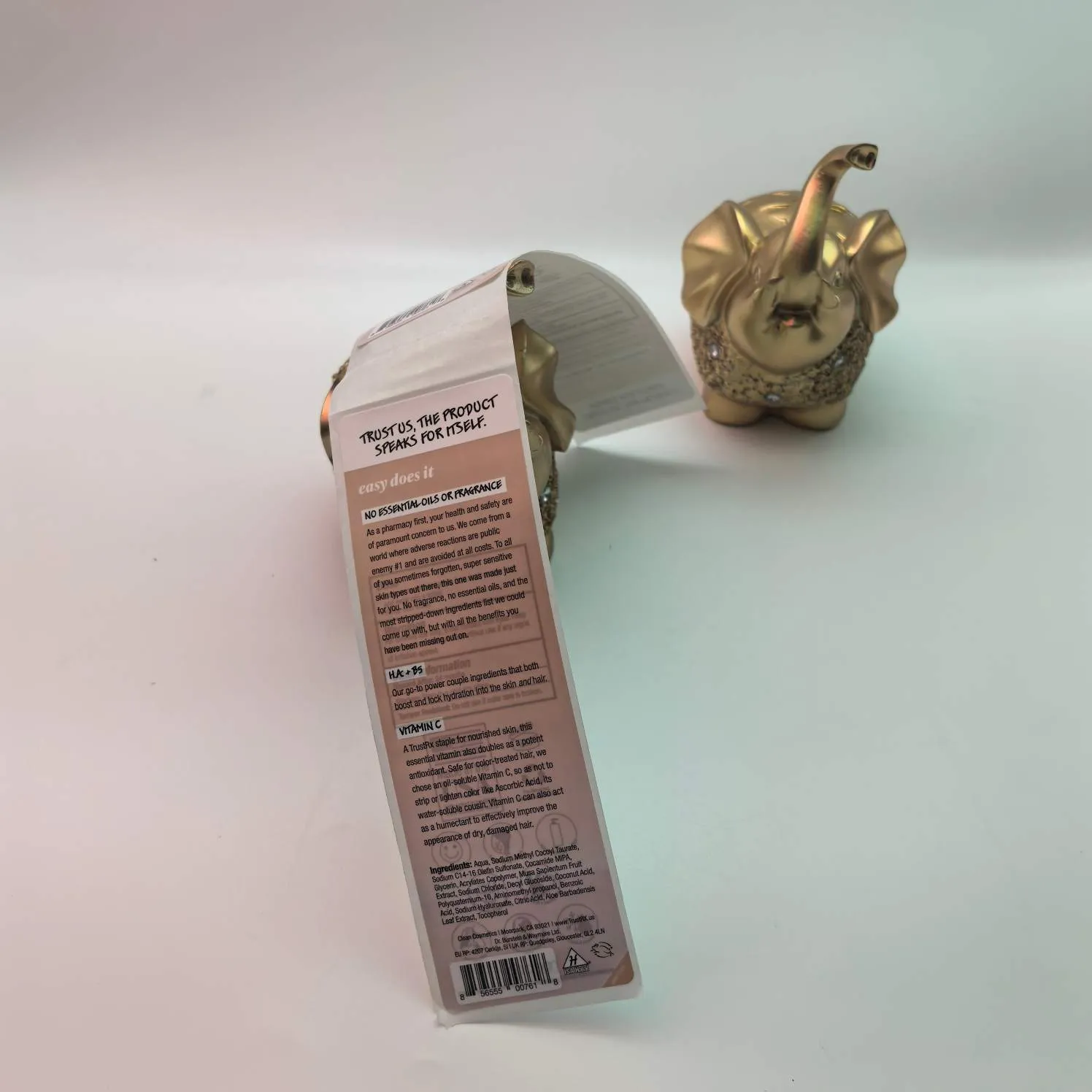 कस्मेटिक्समा जानकारी खुलासाका लागि कडा नियामक आवश्यकताहरू छन्, जस्तै FDA वा EU नियमहरू अनुसार सामग्रीहरूको अनिवार्य सूचीकरण। एकै समयमा, ब्रान्डहरूले ब्रान्ड अवधारणाहरू र उत्पादन बिक्री बिन्दुहरू व्यक्त गर्न आवश्यक छ। कस्मेटिक लेबलहरूको लागि मल्टिलेयरले यी दुई आवश्यकताहरूलाई पूर्ण रूपमा सन्तुलनमा राख्छ, तिनीहरूले पूर्ण जानकारी बोकेर नियमहरूको पालना गर्छन् र ब्रान्डहरूलाई संगठित र आकर्षक जानकारी प्रस्तुतीकरण मार्फत उत्पादन प्रतिस्पर्धात्मकता बढाउन मद्दत गर्छन्।