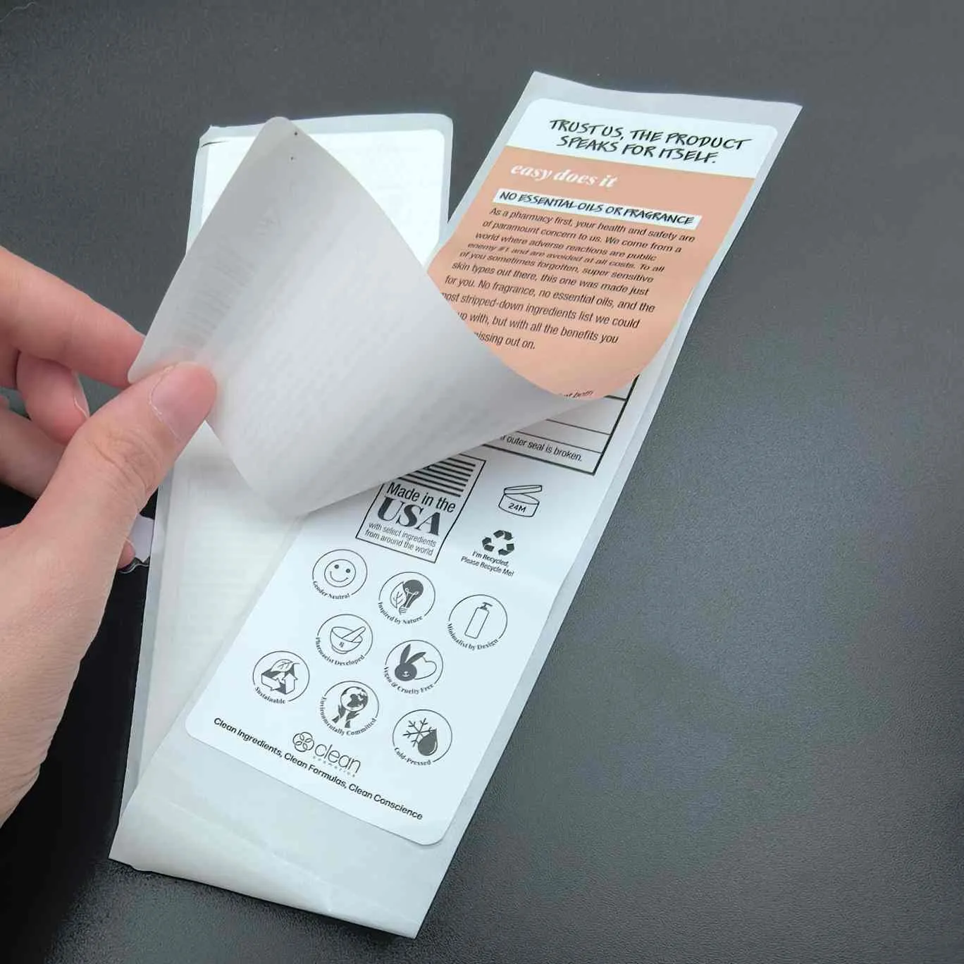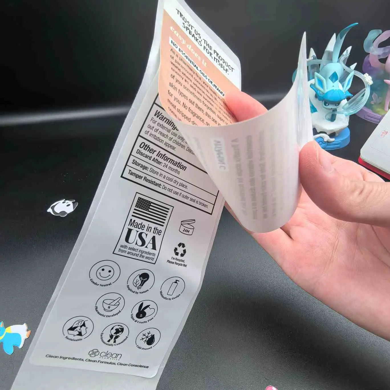 लेबलहरू छिल्नुहोस् र पढ्नुहोस्:सबैभन्दा आधारभूत प्रकार, यसलाई कस्मेटिक लेबलहरूको लागि मल्टिलेयर पनि भनिन्छ। माथिल्लो तहलाई छिलका गर्न सजिलो हुन्छ, र भित्री तहले विस्तारित जानकारी समावेश गर्दछ। यो प्रायः अनुहारको मास्क, सीरम र अन्य साना प्याकेज गरिएका उत्पादनहरूको लागि प्रयोग गरिन्छ।
