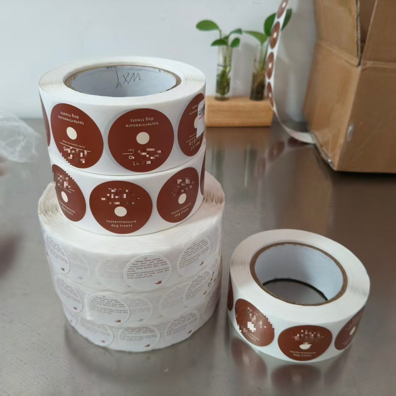 जोजो प्याकडेनिस ग्राहकका लागि कस्टम डग फूड प्याकेजिङ्ग स्टिकरहरूको उत्पादन, निरीक्षण र प्याकेजिङ पूरा गरेको छ, र स्टिकरहरू अब ढुवानीका लागि तयार छन्।